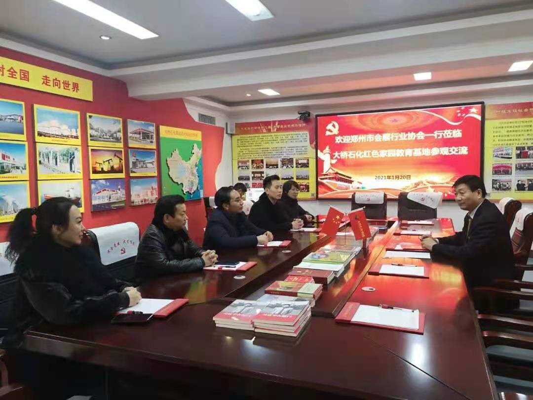 1月20日下午,鄭州天天會展服務有限公司副總經理、鄭州會展行業協會常務副會長夏勝齊隨同鄭州會展行業協會支部委員會參觀了大橋石化紅色家園。中共鄭州會展行業協會黨支部書記李秉禹、副書記邵翠平、鄭州會展行業協會秘書長劉亞娜、鄭州會展行業協會常務副會長馬玉群等人共同參加了此次學習。河南大橋石化集團黨委副書記尤連平、大橋石化黨委副主任申建黨百忙之中,熱情接待并全程陪同。
